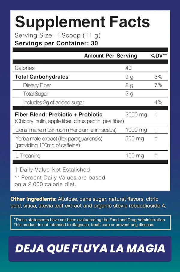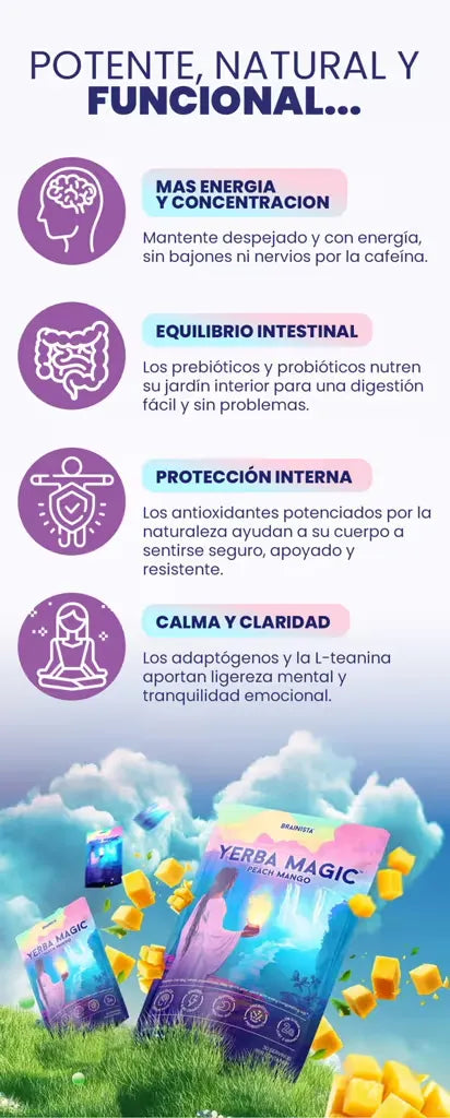 Yerba Magic contiene yerba mate, hongo melena de león, L-teanina y probióticos.